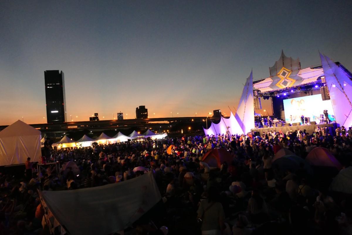 坐在草地上聽著台上的音樂