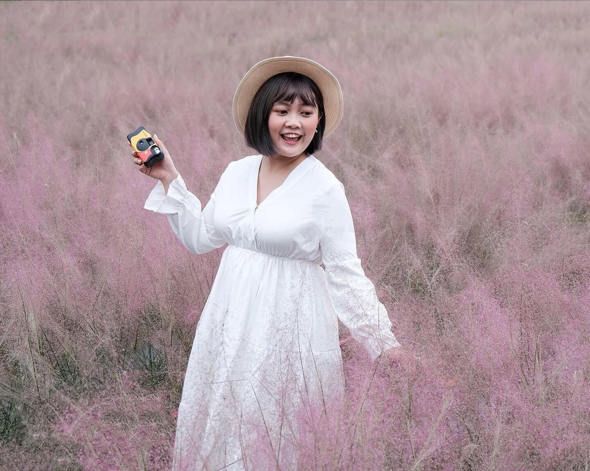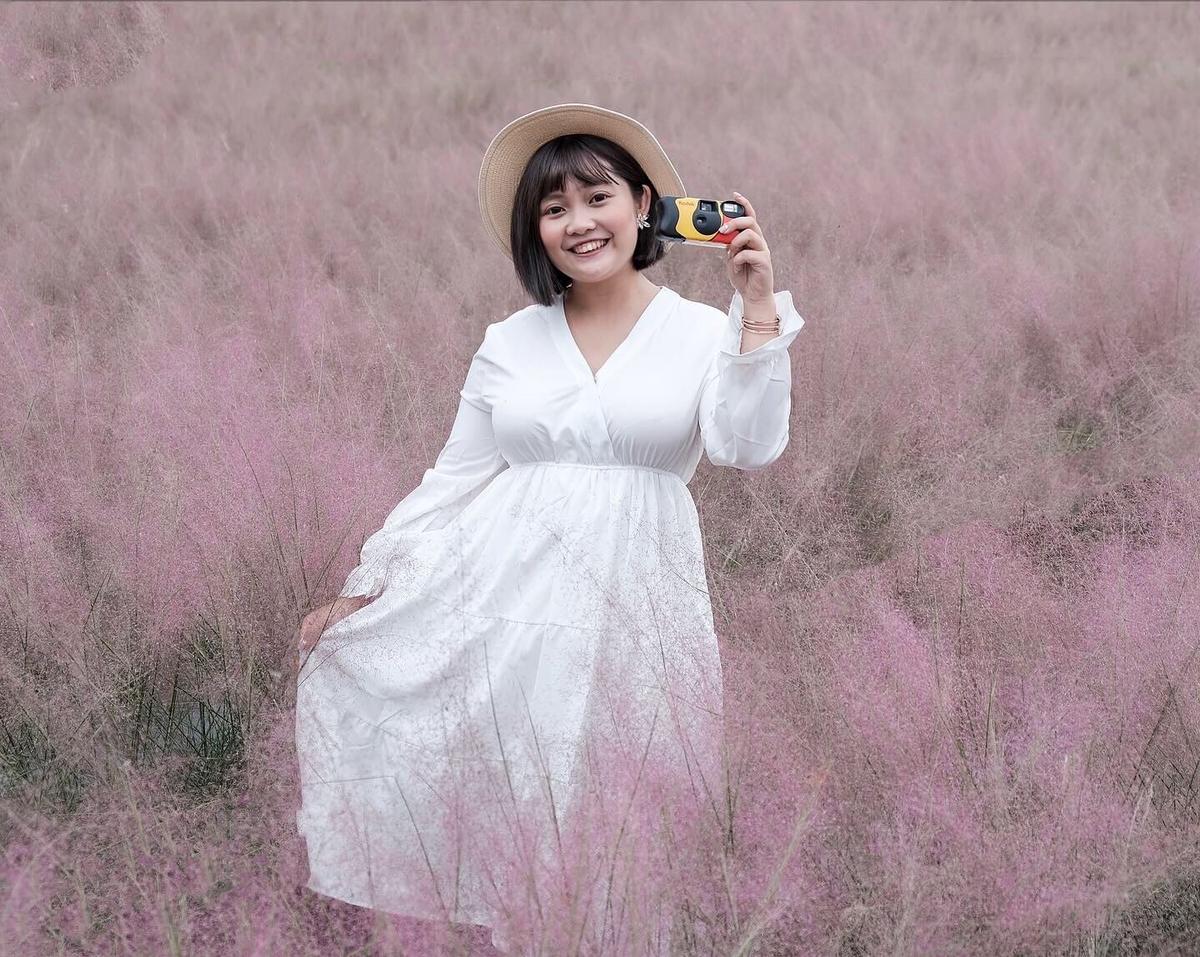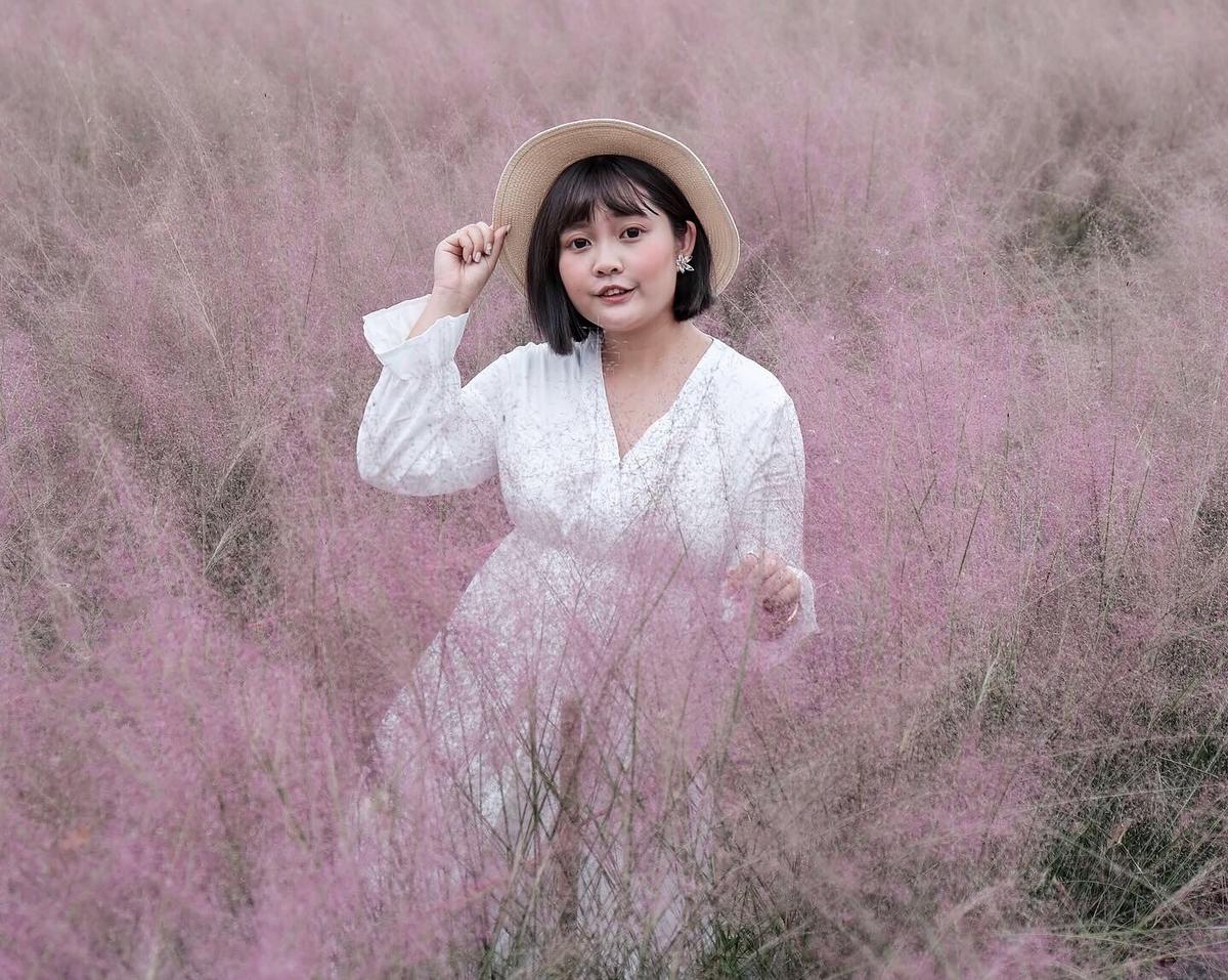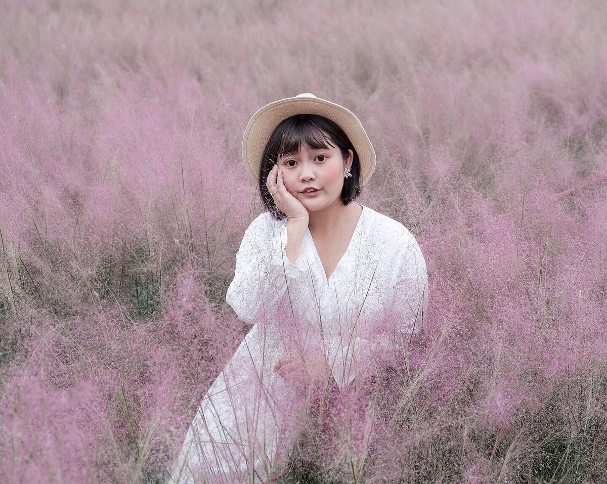 穿著白色系的洋裝👗加上粉色的芒草場景💗