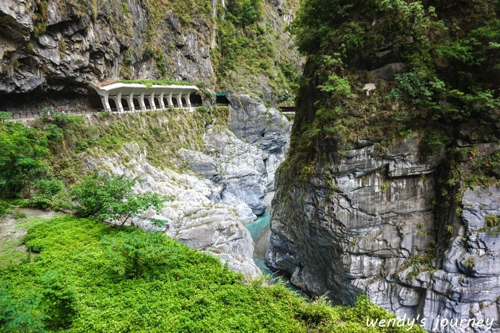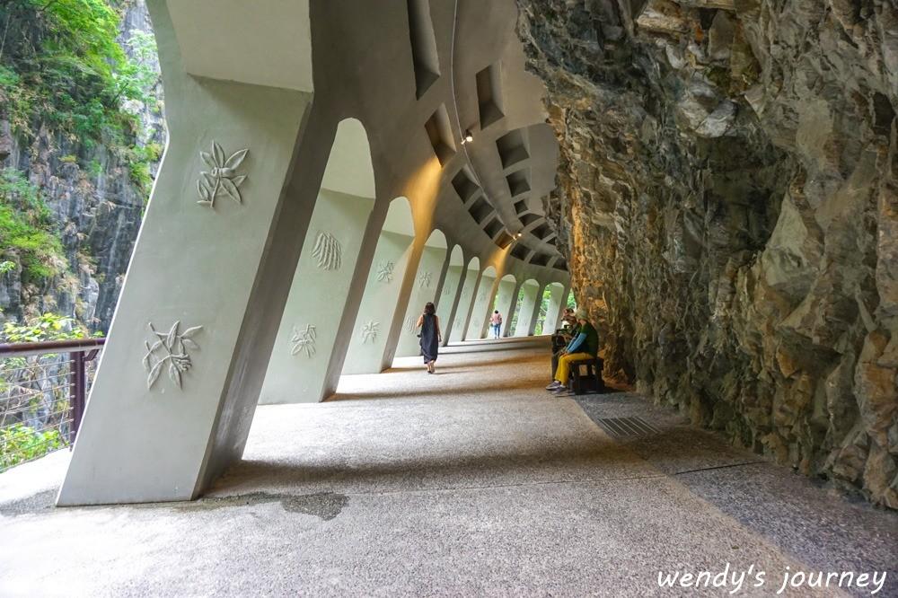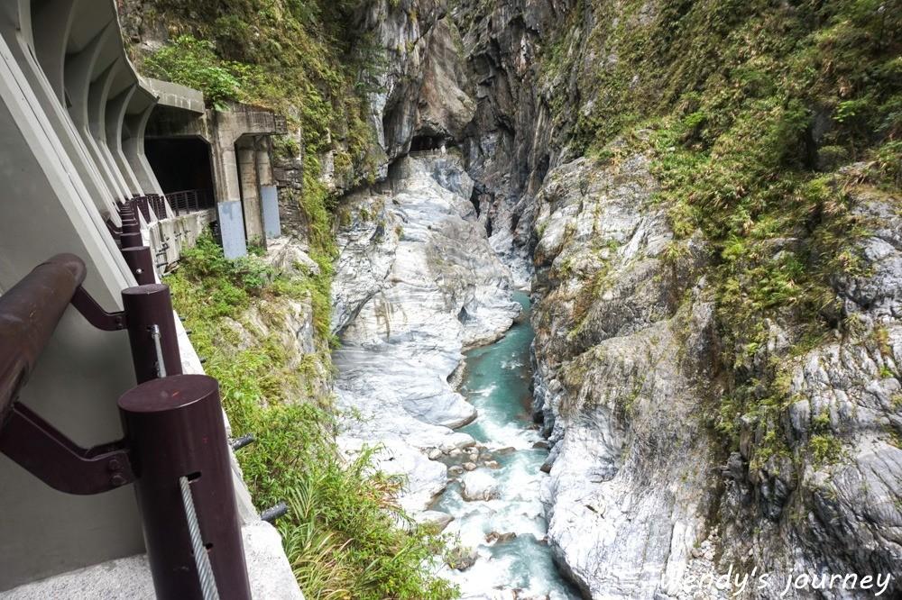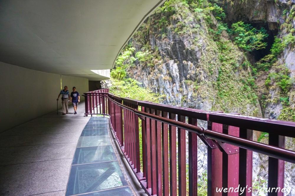 從入口往九曲洞步道走去時,會看到像這樣子的步道,這個景點被命名為「水景步道」,是當初重新整修時,為了防止落石掉落造成意外,因此有了「水景步道」的設計,讓遊客可以安心欣賞峽谷風光。此外,水景步道的地板是透明玻璃製成,走在上面,可以體驗腳下溪水川流的壯闊景觀,我還滿喜歡的。