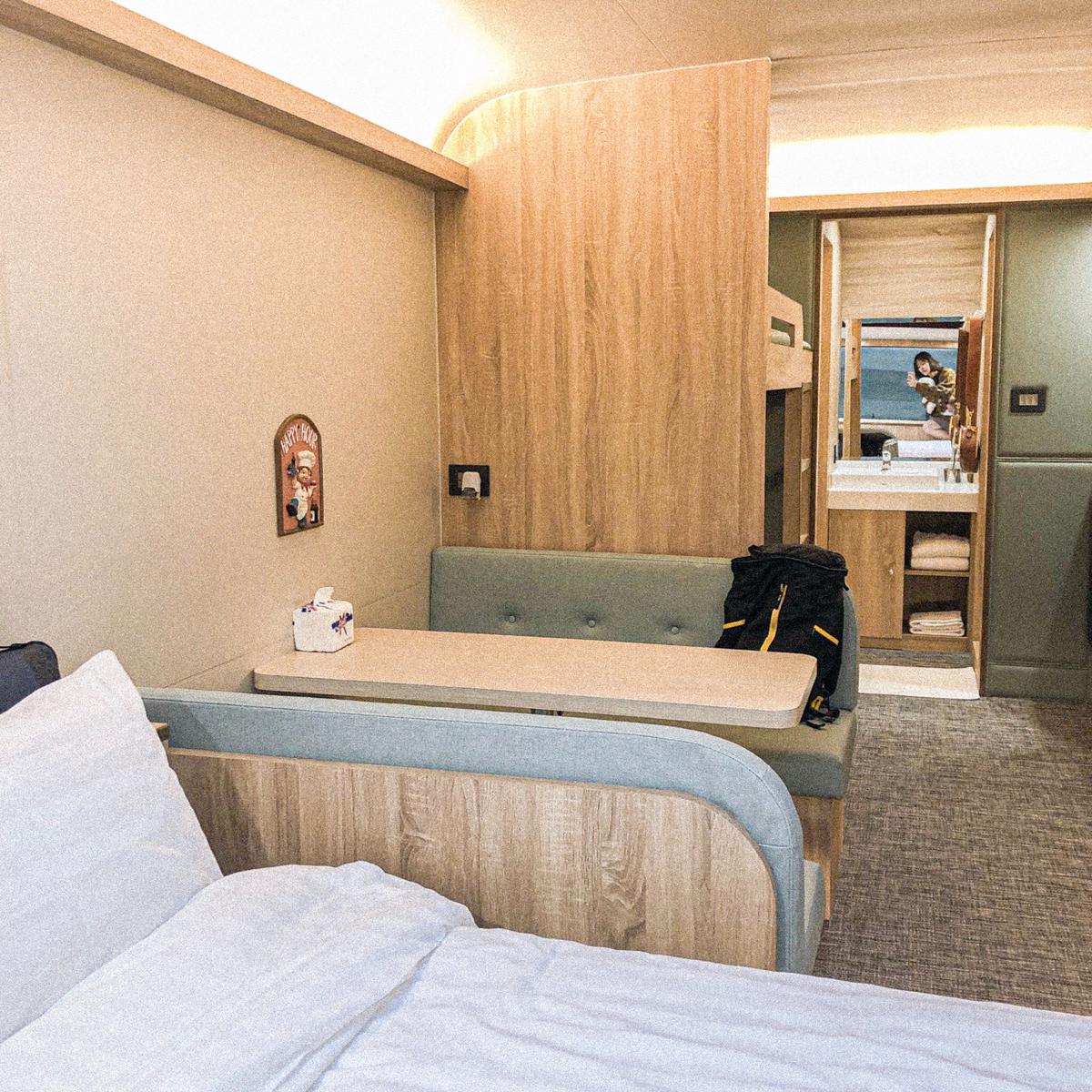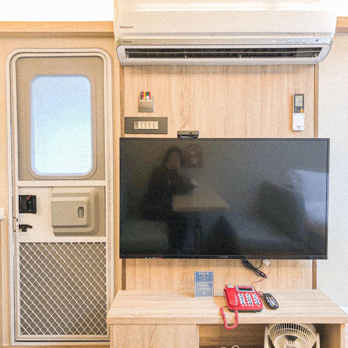 電視、風扇、吧台、流理台、雙人床+上下舖
