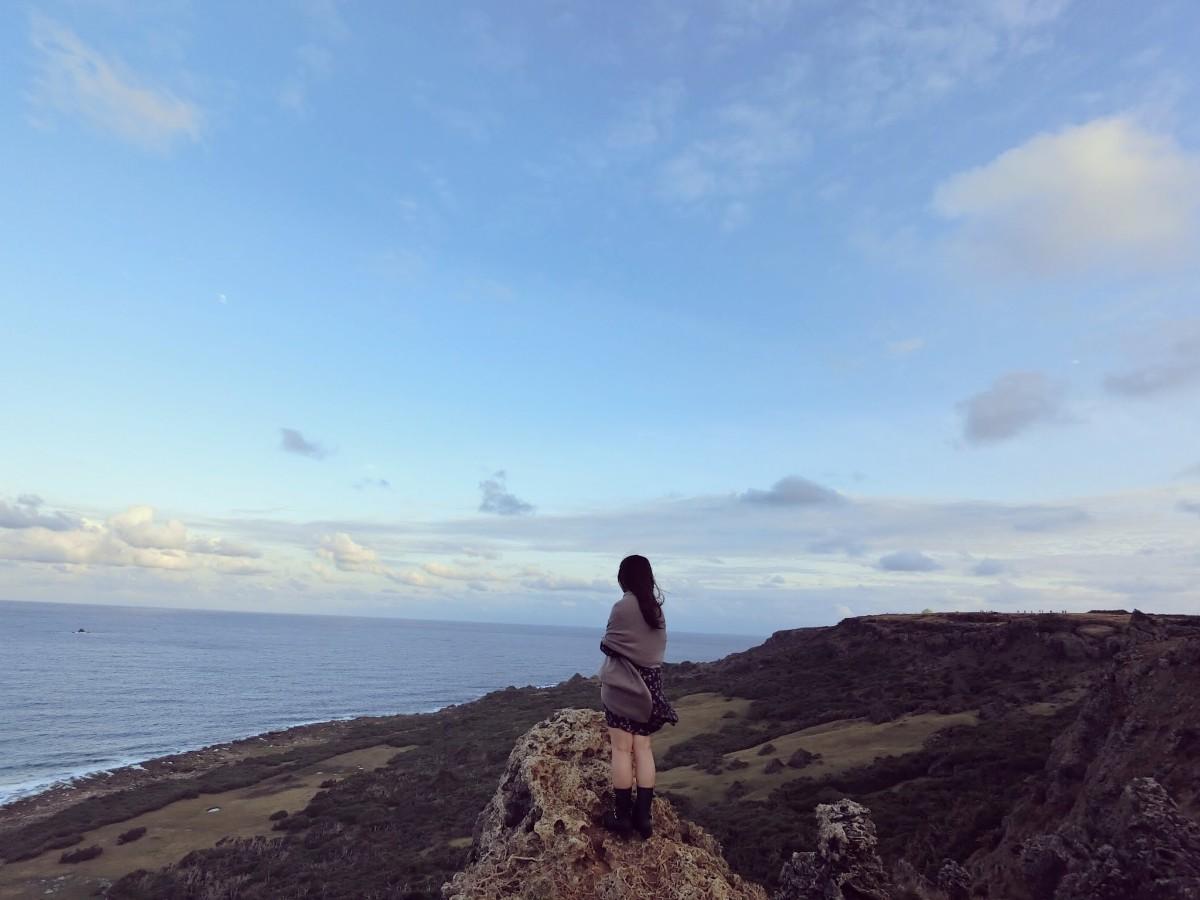 我選擇了下一個入口處走進去,這而人比較少,但相對危險、因為僅告示牌而沒有護欄,在風超級大的墾丁還在至高靠海口,真的我被吹到寸步難行,我坐了下來看著眼前這片風景,偶爾抬頭看看天空,就這樣一個人吹著海風、搖晃的身子坐在一旁,我哭了...