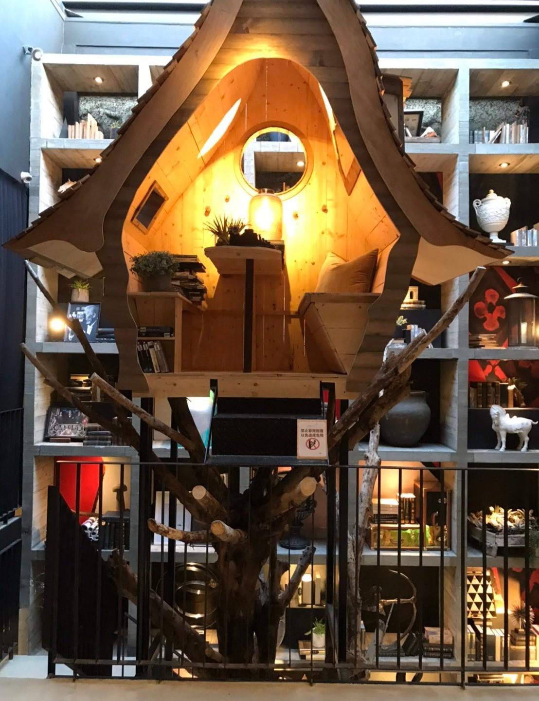看到隱藏在落羽松森林中的巨大貓頭鷹就是知道樂樂書屋到了,樂樂書屋是設計大師張清平一手打造,入場費100,可單日憑發票重覆入場,繳費後工作人員會給您精美貓頭鷹書簽,上面有清楚的館內介紹,目前開放時間只有週一到週五13:30-17:30,一進去就能看到華麗歐風的設計,櫃台旁就是優美閱讀區,華麗歐風吊燈閱讀起來超有氣氛,右後方是自助茶水區,茶水咖啡可以無限暢飲,茶水區旁有四個黑盒子,是四個不同情境主題的廁所,有時間可以每一個都參觀看看,每個廁所的布置都不同,上二樓就能看到蠻多人慕名而來的樹屋區,還有一些藝術作品,右側則是他們的辦公室不開放參觀,最特別的是館內的書不販售只能交換,書屋整起設計華麗又帶點俏皮的感覺,在這裡,一杯咖啡一本書可以豐富你的一個下午