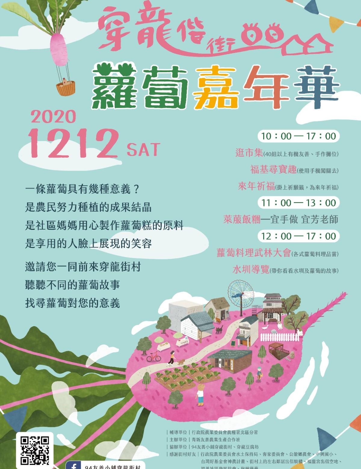 今年冬天,第三屆穿龍街村市集正是以你我熟悉的蘿蔔為主題,要帶大家來去蘿蔔田拔蘿蔔,用粉紅色的蘿蔔捏飯糰、作蘿蔔糕、享用蘿蔔宴,走走180年的水圳,認識田裡的作物,認識我們的土地。 一連串好玩的活動,近40攤在地好物吃/喝/玩/樂通通有!