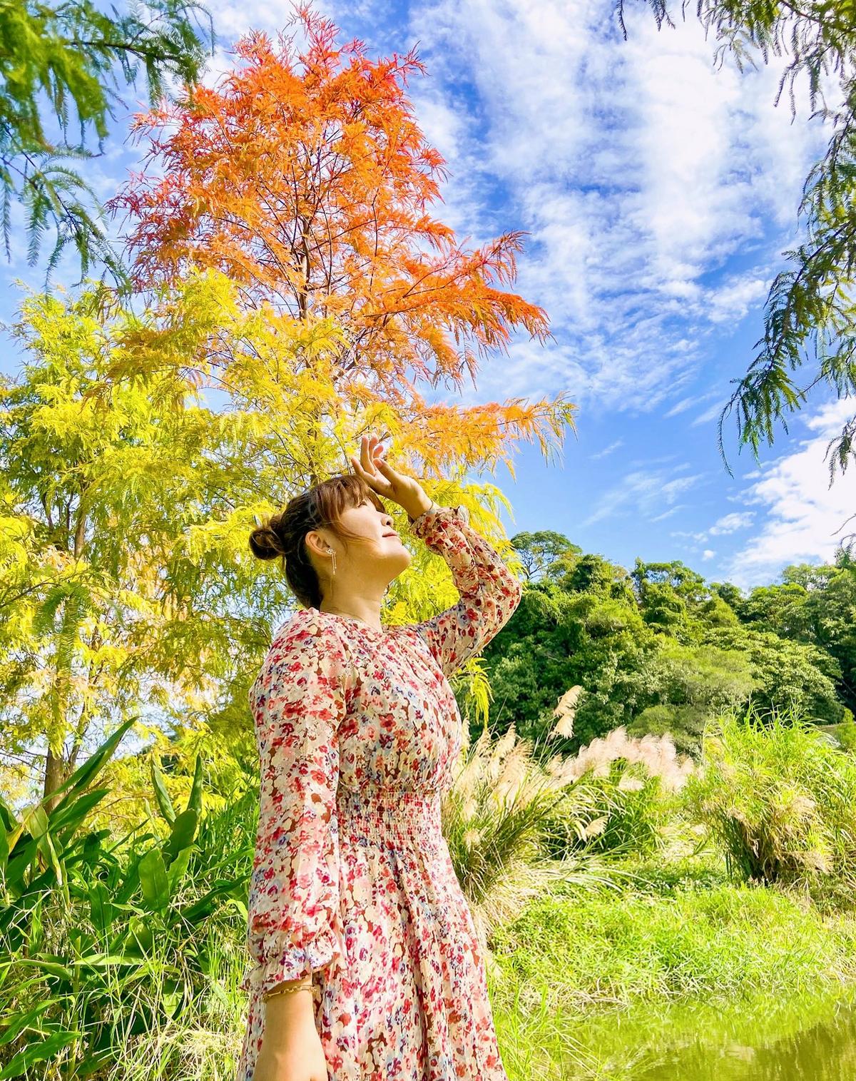 當時落羽松還沒變色,最後發現一株特別顯眼漂亮的落羽松,配上藍天白雲,兩人拍得也很開心,現在或許已變色了吧?