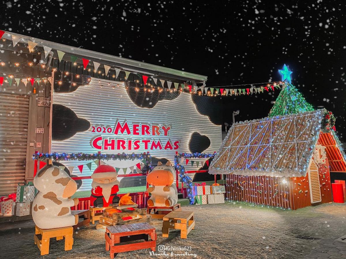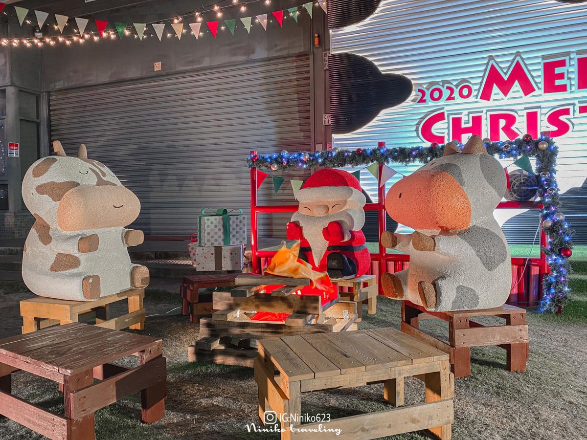 聖誕老公公與乳牛正在烤爐前面互相取暖