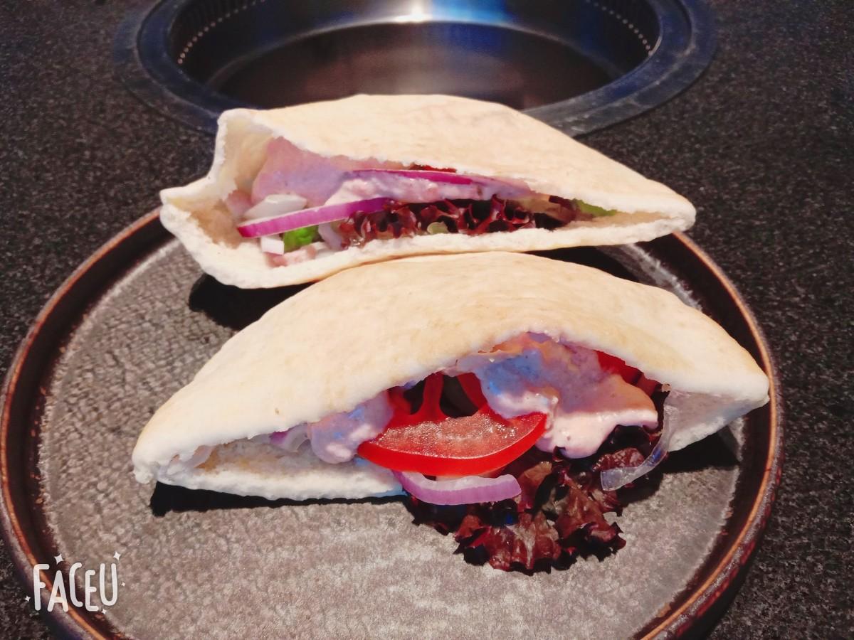 沙拉:袋形沙拉餅,餅皮裡包著生菜和水果很養生。