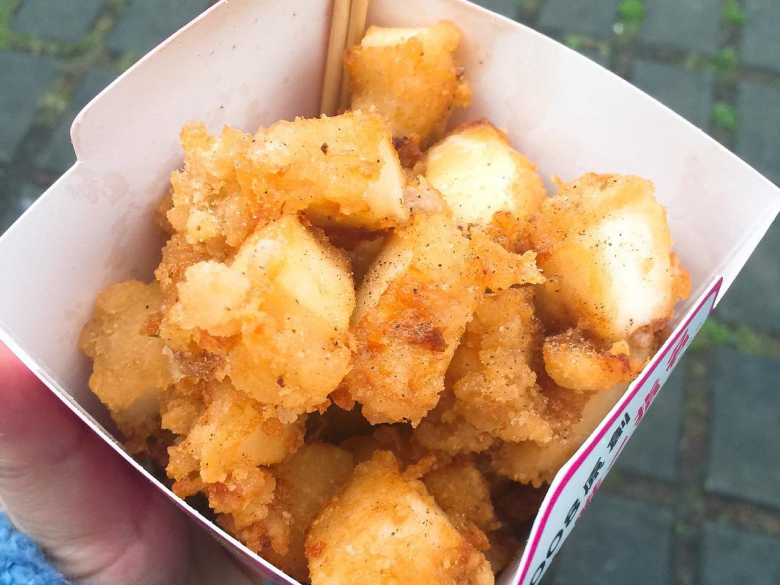 這在夜市裡的人氣真的是超級旺,上面鋪滿了超級多的起司。尤其是非常喜歡吃起司的韓國人一看到這個受不了。裡面的馬鈴薯也是烤得非常酥脆和綿密,上面也會放上火腿片和一些香菜。一口吃下去,不同的味道摻雜在嘴裡,真的是好吃到說不出話來。