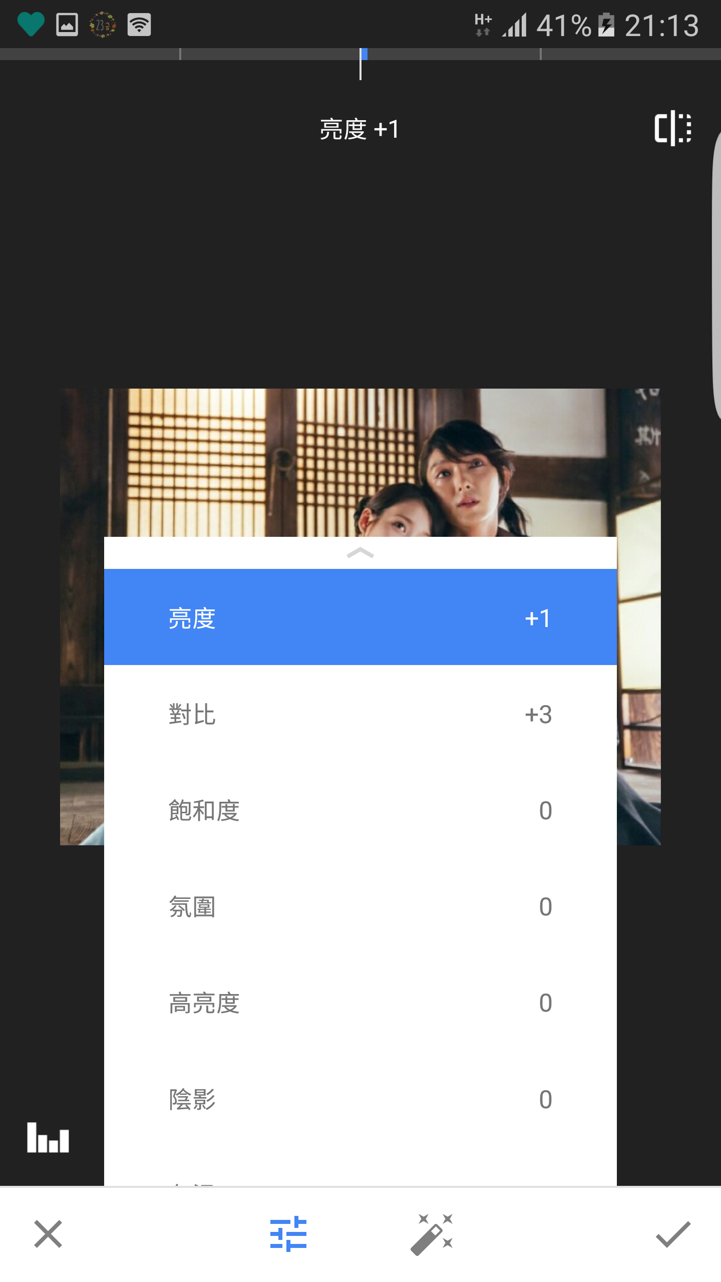 首先小編先示範上排的工具吧~我們先選用第一個功能「影像微調」,可以看到圖片底下的有分成兩種基本功能,左邊是可以手動調整,右邊是自動微調。手動調整可以選擇你要調照片的亮度和對比…等細節,首先小編要調整照片的亮度,只要輕鬆在畫面左右滑動就能調整囉~