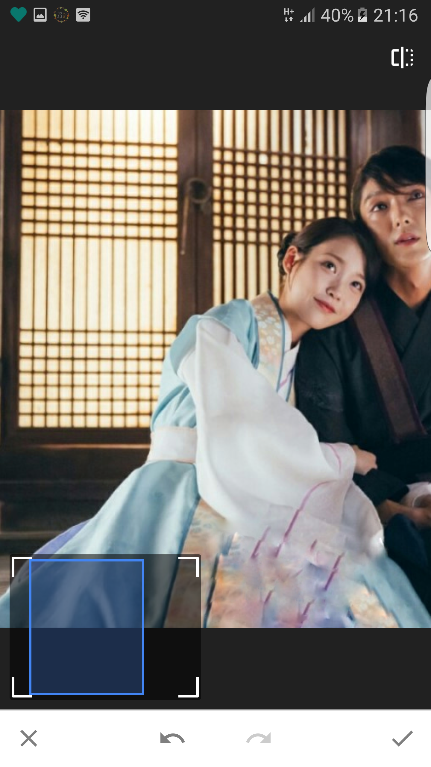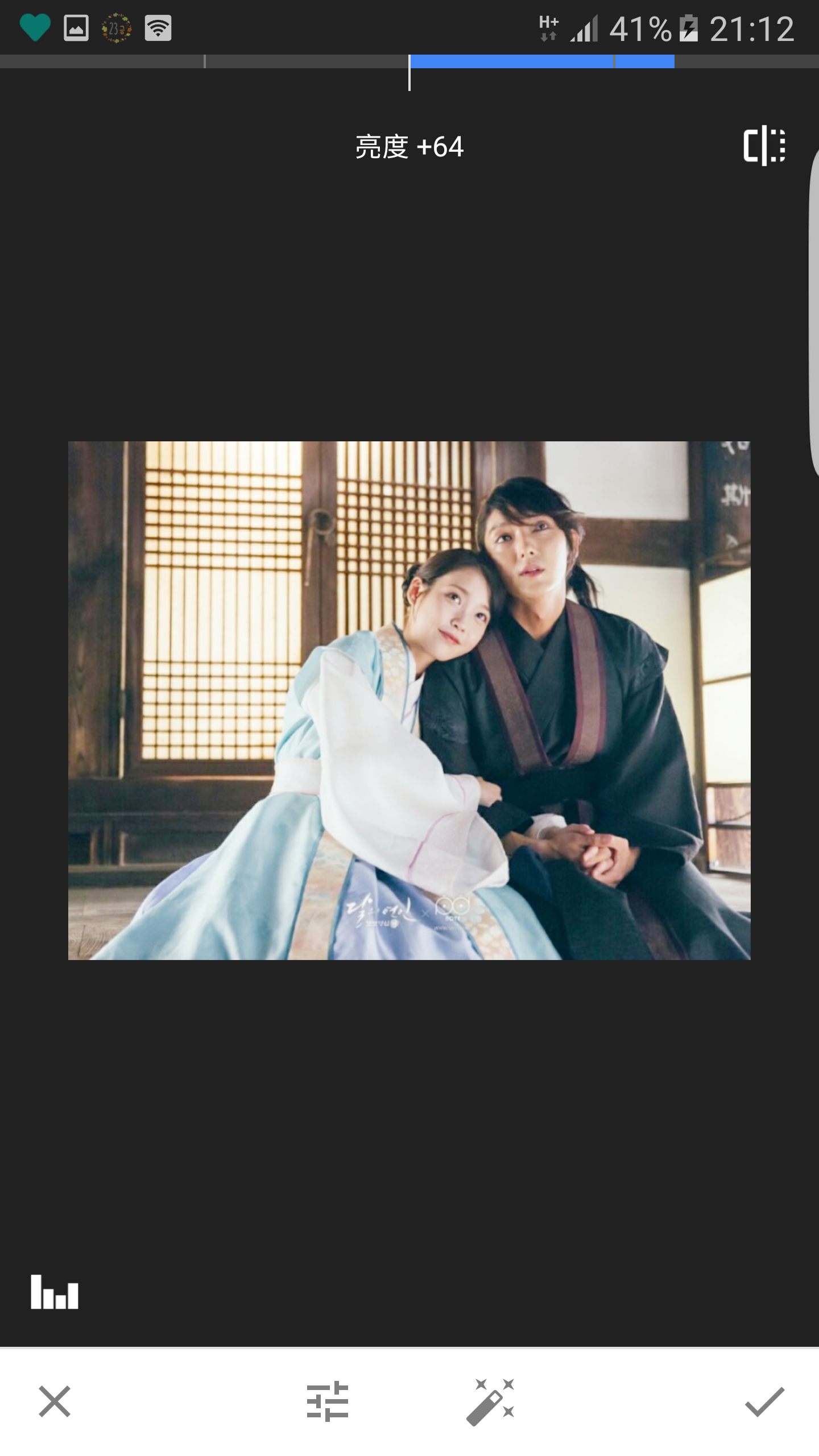 以上這些好玩的功能,小編要額外推薦的是工具中的「修復」啦!修復是什麼呢?就是可以將你圖片中不喜歡的地方給修復掉啦!像是小編覺得昭樹CP給的糖實在讓小編甜到蛀牙就忍不住把它們變回現代去了,只要將想要修復的地方用手指化住,他會顯示紅紅一條你畫的範圍,之後就會幫你自動修復照片啦!是不是很方便呢?
