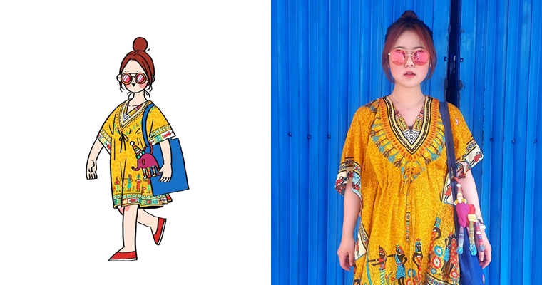 這就是編輯之所以會注意到她的原因,她將照片裡的人物,用她可愛的插畫,神複製出另外一種風格!利用IG多張照片的功能,第一張照片放上插圖,往右滑則是真實的照片,插畫版vs.真實版,細膩地將自己的穿搭重點都畫出來,實在是太令人驚艷了!