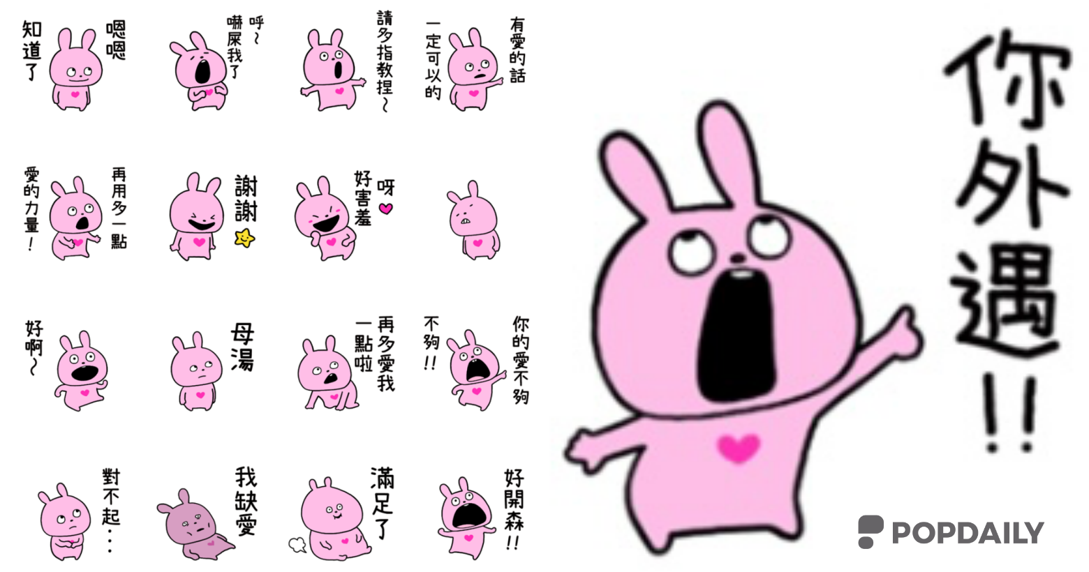 你最近有看過這隻粉色兔子嗎?超浮誇表情配上「你對我膩了?」、「你外遇!!」、「那個有比我重要嗎?」等等超情勒文字,簡直就是近期最最好用的貼圖!喜歡這隻兔子的朋友們,親切稱呼它為「外遇兔」,那麼外遇兔真的有這麼可愛嗎?今天來一探究竟!