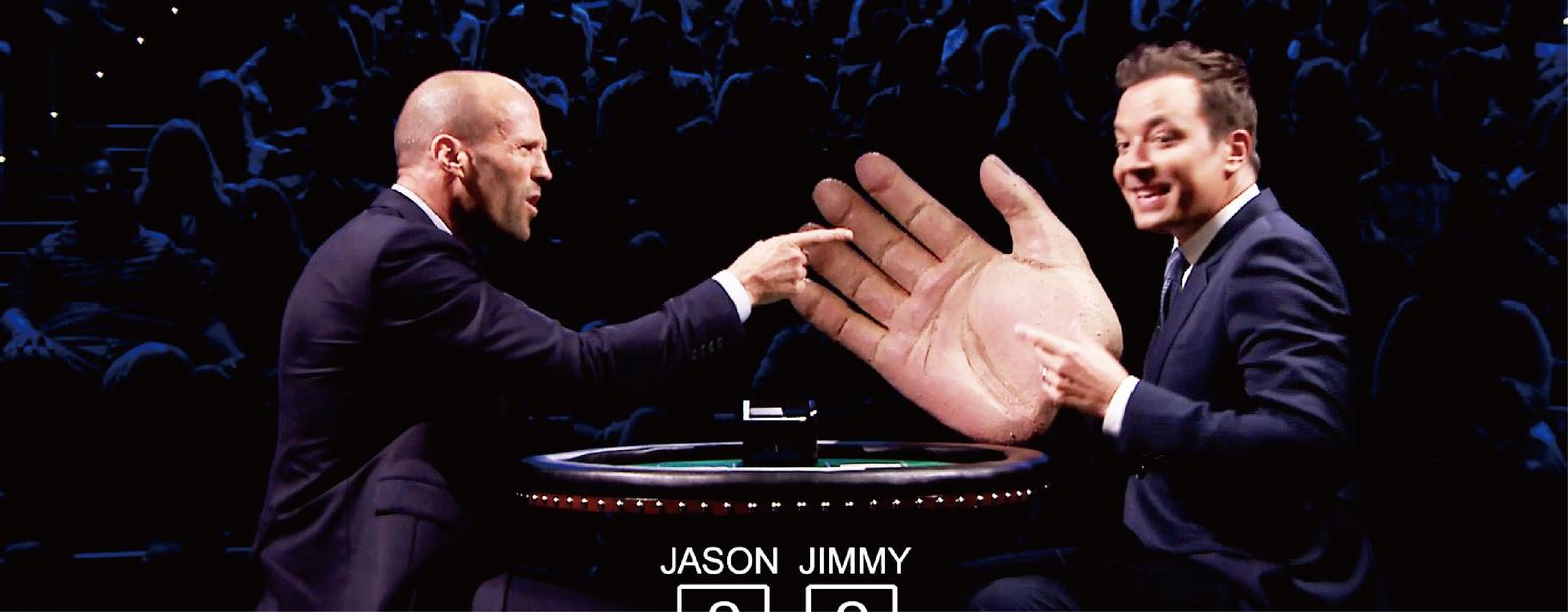 到底是誰敢甩傑克史搭森的耳光?想不到吧哈哈!答案是美國喜劇演員吉米法隆!日前傑克史搭森參加了吉米法倫的今夜秀,竟然玩起了打巴掌遊戲,讓現場觀眾們都大吃一驚而且都笑到不行,一開始的遊戲規則跟撲克牌的21點一樣,但輸家的懲罰卻是被打一把掌而且還是特製的超大假手!誰知道傑克史搭森連一場都沒贏哈哈,而且遊戲過程中還一直帶著凶狠又搞笑的表情看著吉米法隆哈哈,想不到在《玩命關頭7》被稱為地表最強的反叛,竟然可以從頭輸到尾而且還被打巴掌,我想一定是最近演出《麻辣賤諜》把硬漢的搞笑細胞給激發出來了!快來看看這段爆笑的互動哈哈。