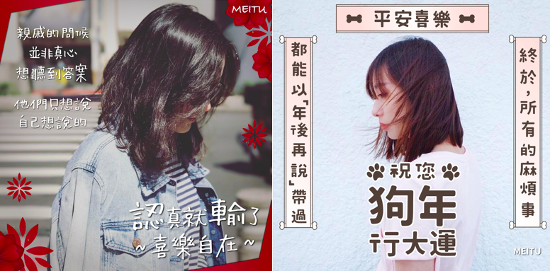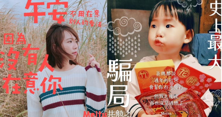 就是因為聽到我們心中的無奈OS,美圖秀秀最近新推出一系列過年的邊框,讓我們大家可以自由套入自己的照片裡,而且上面的字真的都中肯又微酸,讓人看了忍不住掬一把辛酸淚,默默地贊同啊!過年如果再被白目的問題轟炸,真的可以製作這一系列「長輩圖」,來個長輩圖的逆襲啊~~~