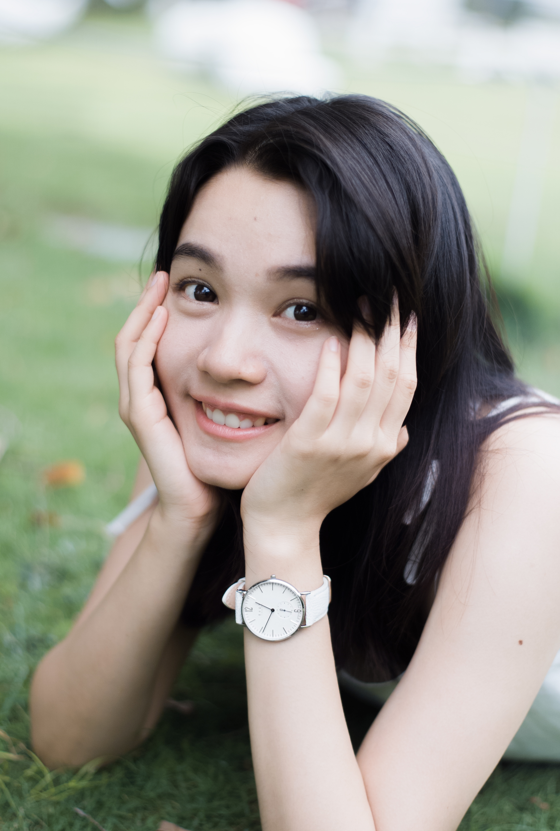 搭配白色長洋裝,漫步在綠園道裡,真的很有透明系女孩的感覺~