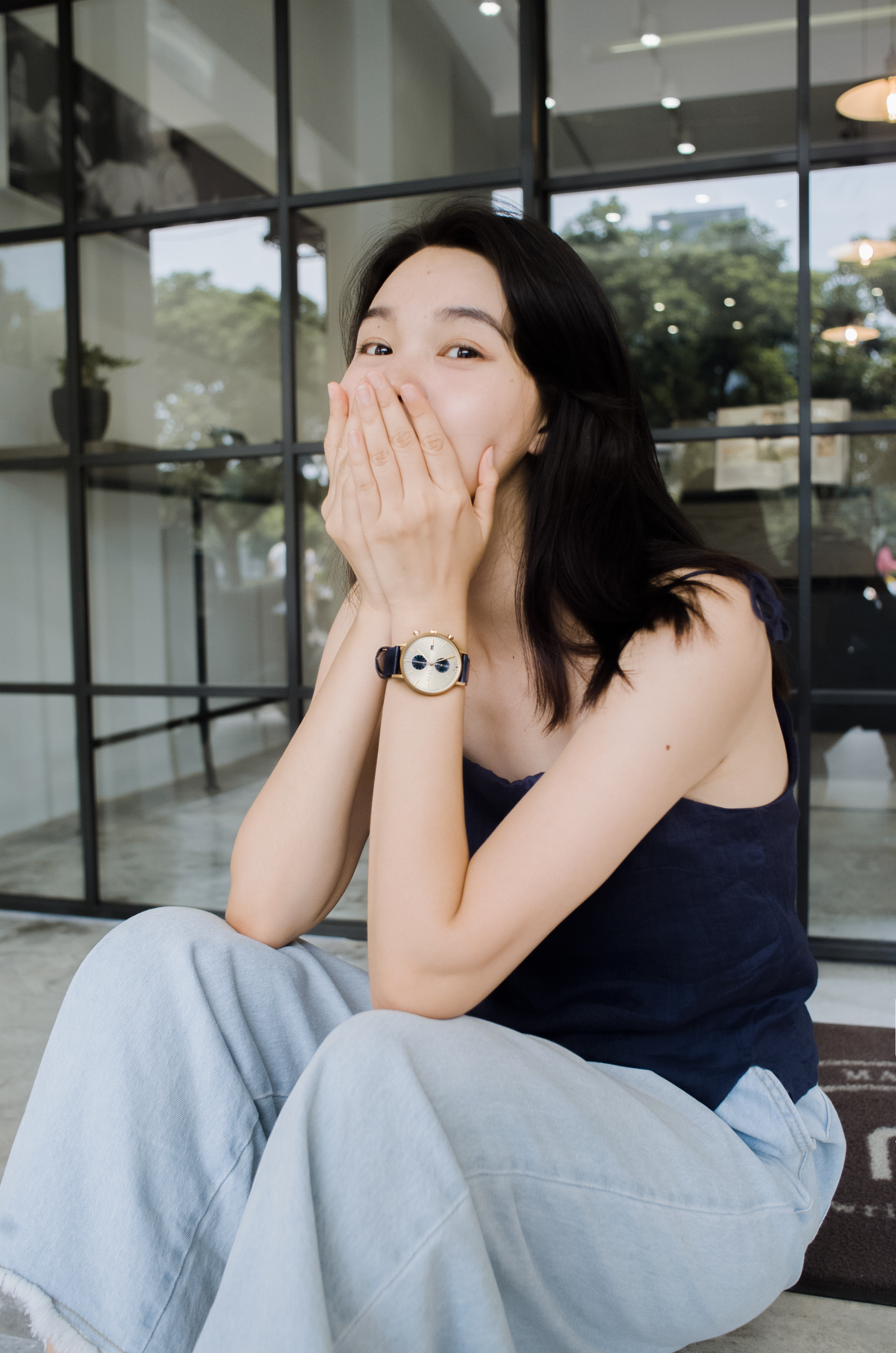 搭配藍色細肩帶背心,加上寬鬆的丹寧褲,帥氣又隨性~