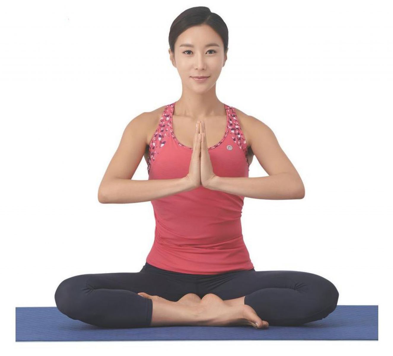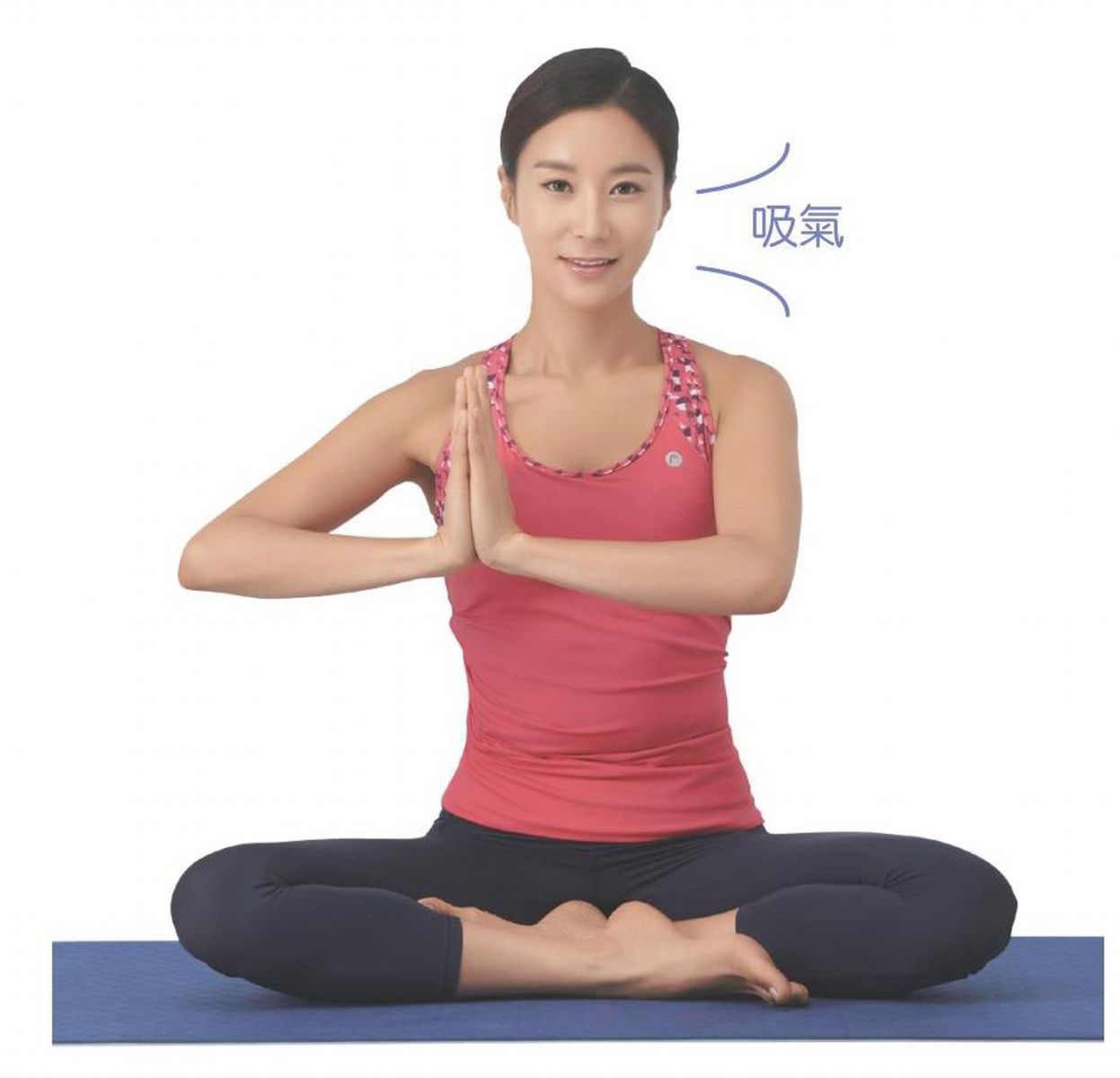 呈盤腿坐姿,雙手合掌,平舉至胸前。