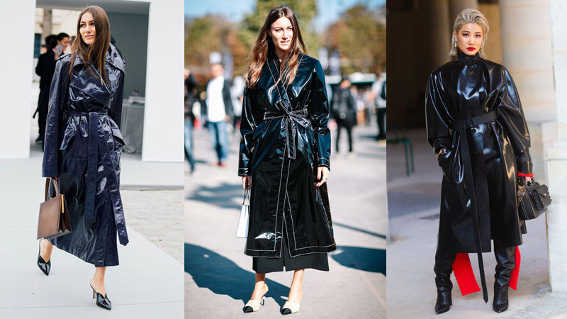 過去的雨衣總是又醜又難看,即便改變花色總是脫離不了過去的樣子,今年許多時尚品牌紛紛推出風衣式剪裁的雨衣,看似漆皮的材質有一定的防風防水功能,面對風雨比較大時,除了撐傘,還可以再套上一件這樣的雨衣,避免裡面的服裝被雨潑溼,同時這樣的風格更有種都會摩登的魅力。