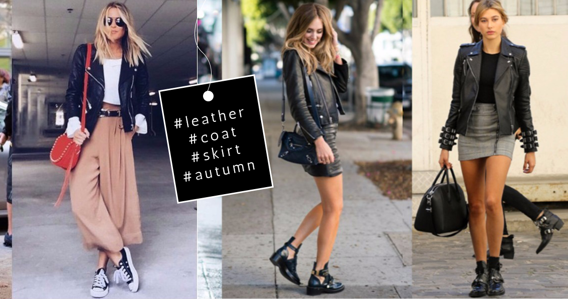 穿上短裙露出長腿,往往能讓女生更加性感與俐落,在配上皮夾克後,更能在這樣的風格上多了幾分個性,也讓打扮變得更加俐落。在整體的搭配上,可以以全身皮革做為搭配, 展現一種火辣辣的帥氣氛圍。如果覺得全身皮革過於搶眼,想要帶有更多甜美感覺的話,可以將下身的裙子改為更加柔軟的布裙或是牛仔裙,穿出更加年輕與甜美的風格。